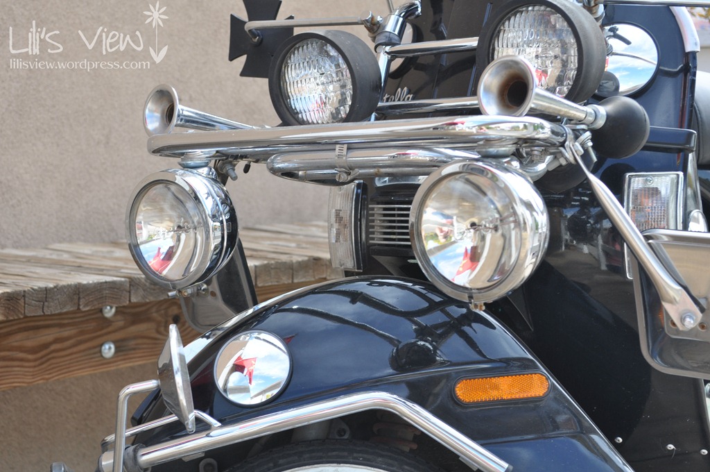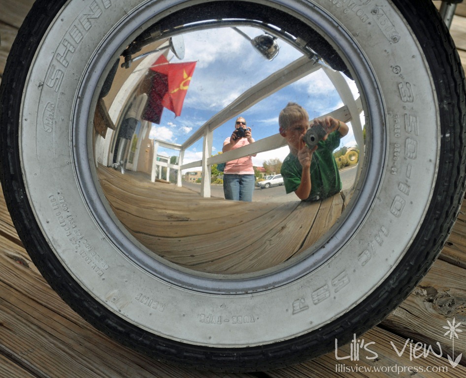 After carefully examining my inspiration file I went out in hunt of flowers. Being as it was such a hot and dry summer here, I knew the flowers would not be as grand as from spring. I went to Santa Fe knowing I could also go around The Plaza. Being as my son had had such a good time going with me to Old Town, with a camera of his own, I thought this would be good for both of us. It started out good, we found this awesome scooter that we both liked photographing. We both realized that the hubcap was rather reflective and took pictures looking into it. I love how, when I got the picture on the computer, you can see a whole picture inside the hubcap. I also love how in the other shot you can see reflections inside each of the lights and anything some-what reflective. (I also only just now noticed the bike horn.) I am totally in love with this scooter.