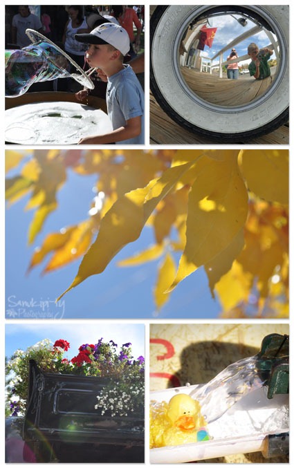 The rainbow colors in the bubble, I only hoped to get the bubble to come out in the photo. Our reflection in the hubcap. We could tell we could see ourselves, but it was a surprise at first. The sun flare on the leaves, this was the first time I had achieved this. The rainbow on the back of the truck and the water droplets bouncing off the duck were completely unplanned and a little surprise that added to the photo.