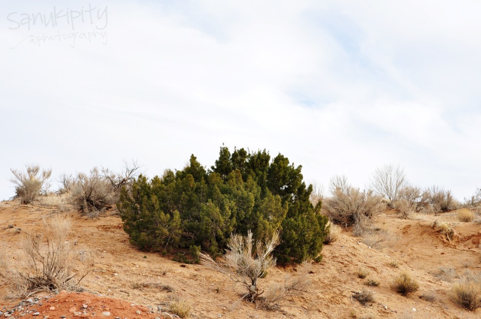 I went out walking. In the daylight. With the doggies. I took my camera. I was in search of warmth. I could see a lot of brown, sand and weeds, but nothing that really cried out warmth. Until I came upon this evergreen bush and the green-ness of it yelled warmth amongst all the brown and dryness.