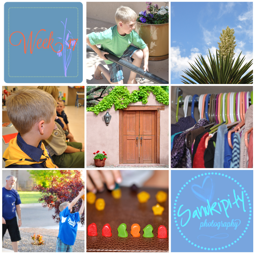 Day 113: Mr B was working for Papa, to pay him back. Long story on the reason why but I fear for the teenage years already. Day 114: The yucca are in bloom. The flowers are pretty cool looking. Day 115: It was Space Derby day. Had to build a rocket. Mr B sat on his in the car and broke a wing. I was too upset to be able to help him, Nana had to glue it back on. Day 116: Another drive through Corrales, I love that road. This side gate was just so enchanting. Day 117: Part of my work shirts, most of which I don’t wear right now because I find that I need shirts that don’t scoop and won’t snag because I lift and bend and heave boxes all day. Day 118: Mr B and Papa playing a little basketball. Day 119: Mr B has decided he likes the Kellogs fruities that are shaped like characters. These were Mario. They were playing. (As always, all photos are full size at my flickr account. There is a button at the bottom of my blog.)