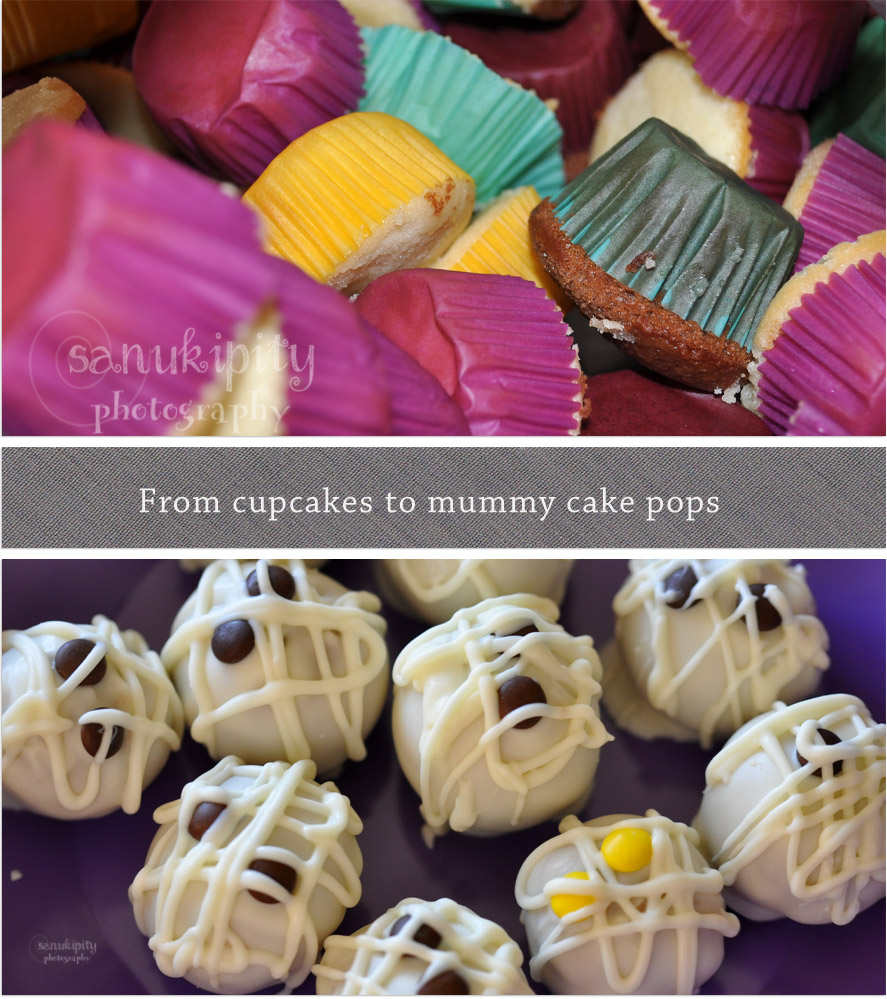 My failed cupcakes from when I was going to take them to Mr B’s soccer game for his birthday. The game was cancelled so I froze the still eatable cakes and made them into the mummy cakepops.