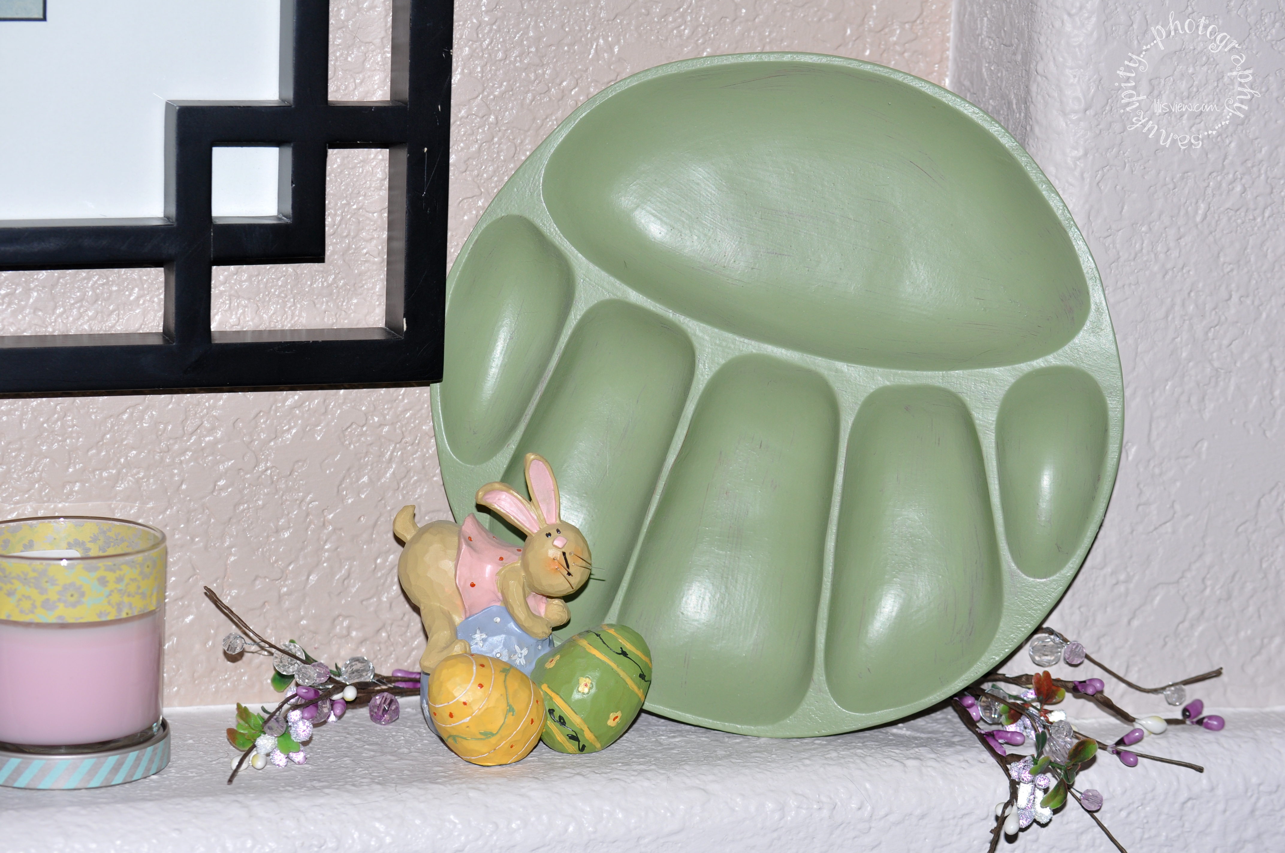 This bowl? If that is what you can call it. It is wood, I picked it up at a thrift store forever ago. I found it in the garage in one of my semi-finished projects boxes. I had painted it before putting it in the box. This is the first time I have ever used it. Went good with the bunny. The candle I had, I just added the pieces of Washi tape.