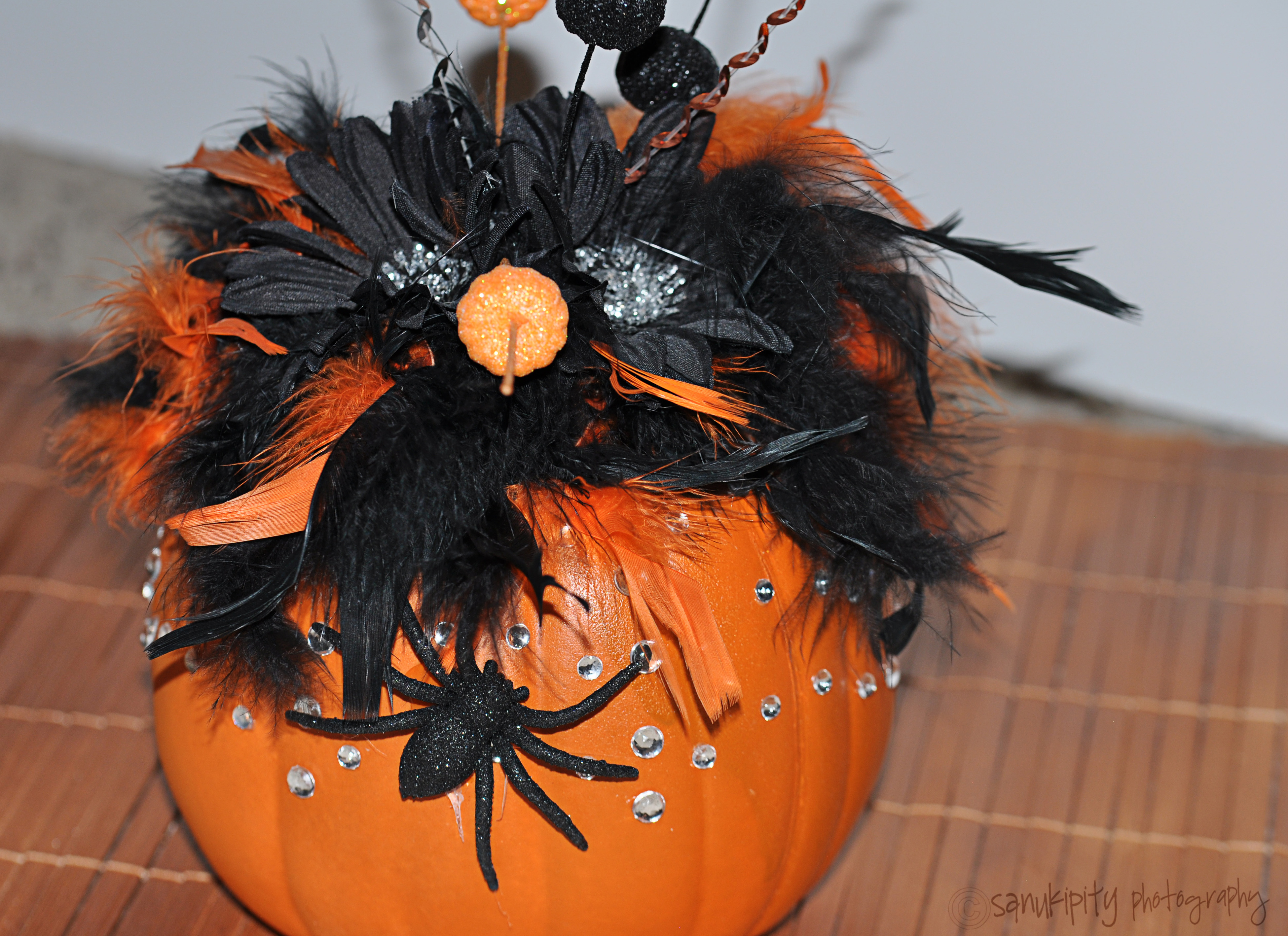 day 8I would love to say I made this for my mom, but I think her neighbor made it. Do you see the “owl” face in the feathers? The two silver eyes and the pumpkin nose. The spider would be crawling up its body. Maybe a stretch on eyes for the one challenge I am linking up to, but I am sticking with it.