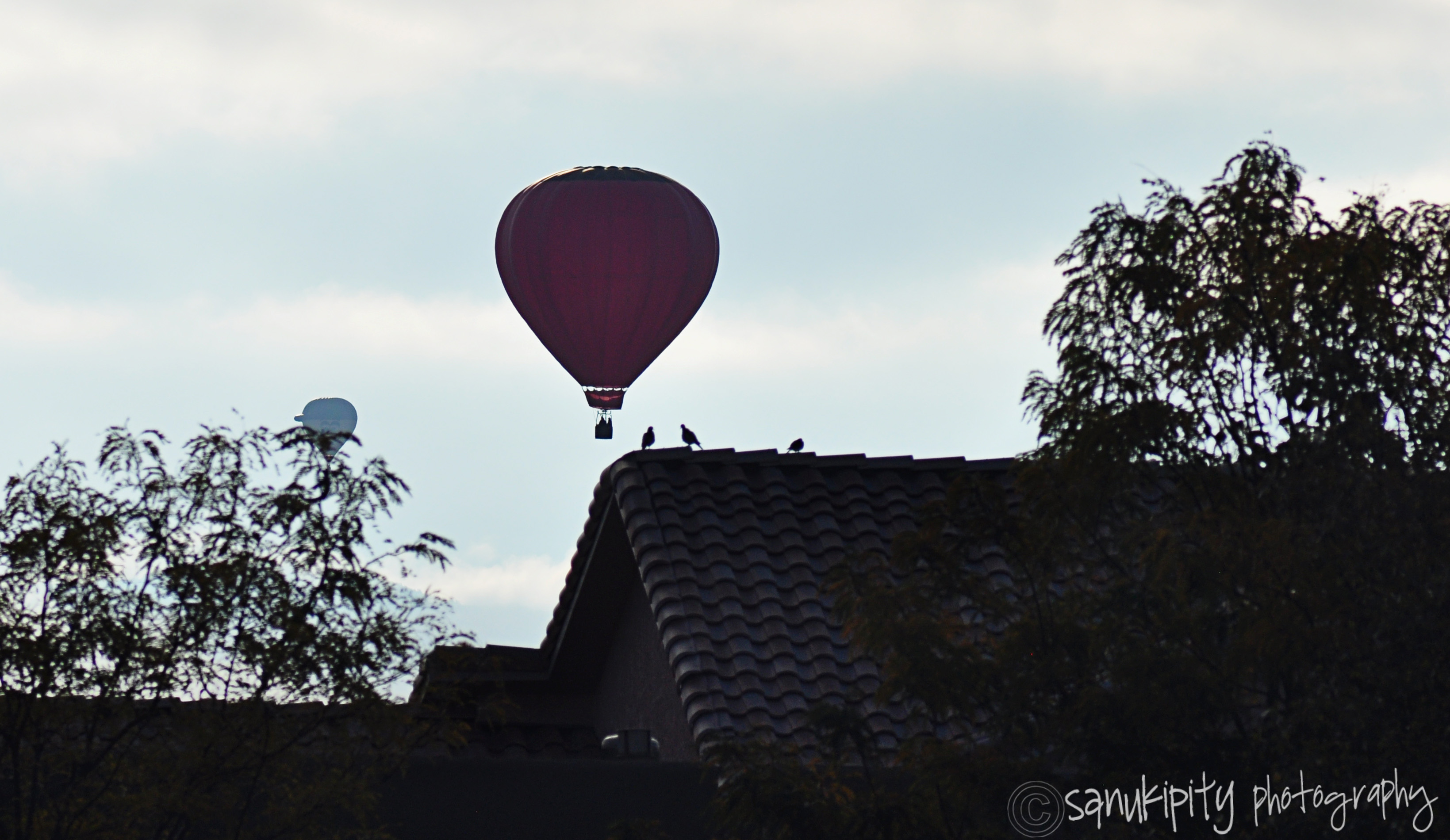 Only bad thing about the balloons going up so early and where I live relative to the balloons ascending is that the sun is right behind the balloons. The sky was pretty cloudy today still as well. Lower in the “valley” where they ascend, it also looked a little fogyish. I hurried the doggies home and rushed my son out the door so we could go get a closer look. I realized it was close enough in time to his appointment for his flu mist so I went back inside and changed. Came rushing back out to find a balloon right over the golf course.