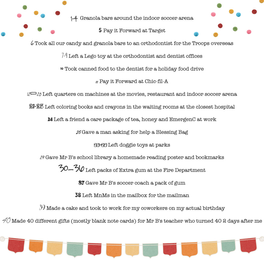 The 40 Gifts Posted byLili11/28/201411/24/2014Posted inphotographyTags:gifts, gratitude, RAOK To recap my month of giving for my 40th birthday: Share this: Click to share on Facebook (Opens in new window) Facebook Click to share on X (Opens in new window) X Click to share on Pinterest (Opens in new window) Pinterest Like Loading... Related Published by Lili Single mom trying to find fun and happiness thru the lens. View more posts