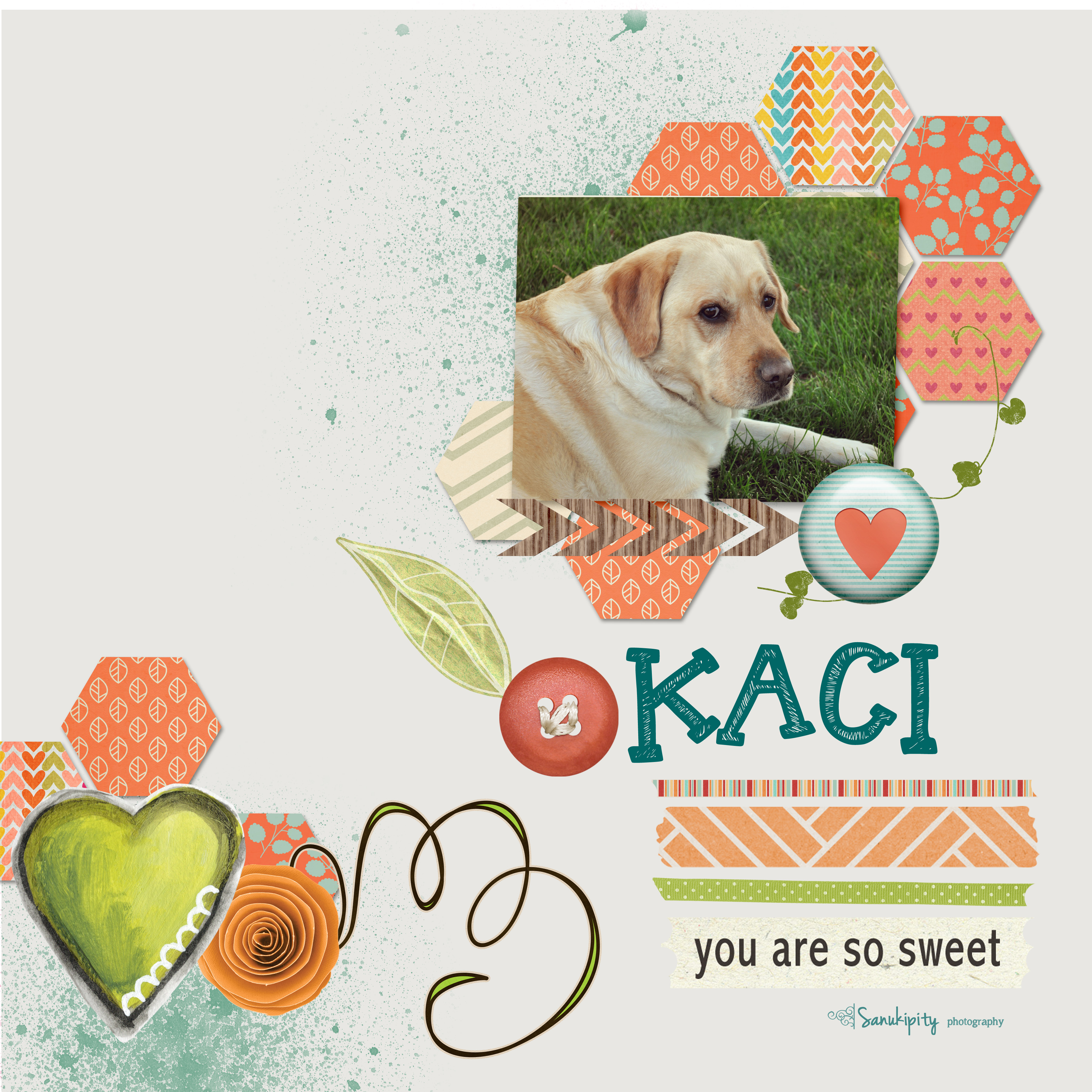 I think this is my most favorite page yet. I love the colors. A little story about this dog. She will be 6 this spring, so 6 years ago my mom decided my dog was too lonely. You could tell she terribly missed her buddies (my parents’ other two dogs). So my mom got Kaci here. Well, a puppy was not what my dog needed. Kaci was a nip at your heels little munchin and even though we all loved (and love) her, my dog was not at all impressed with her. Kaci also ended up being the reason for my dog’s high blood pressure which affected her eyes and which ultimately is why we had to have her put to sleep in December. But this spring, when my mom turns over her garden, she will bury my dog’s urn with her two missed buddies (though I believe she is already running with them in heaven).