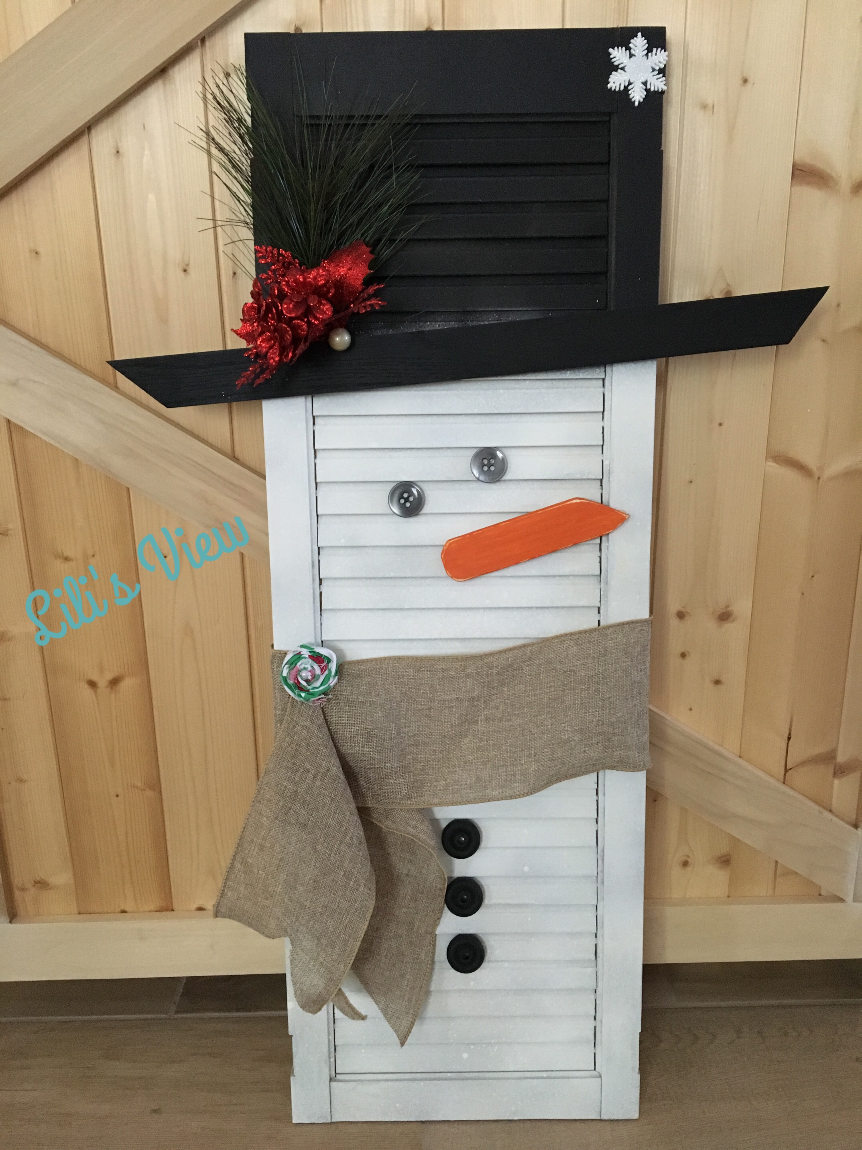 I made a snowman out of the 3rd shutter. But I just don’t find it as cute as the inspiration. Again, I only lightly sprayed it with the white paint. It even sprayed blotchy but I thought that would okay since it would look like snowflakes. Then I sprayed the black area with an idea of where I wanted the hat. I think the hat rim is a paint stick. The nose is a piece of wood I found in my stash and cut and sanded before painting it orange. The buttons are pieces I had in my craft stash and painted black. Everything else I had laying around. Maybe I need to add a smile?